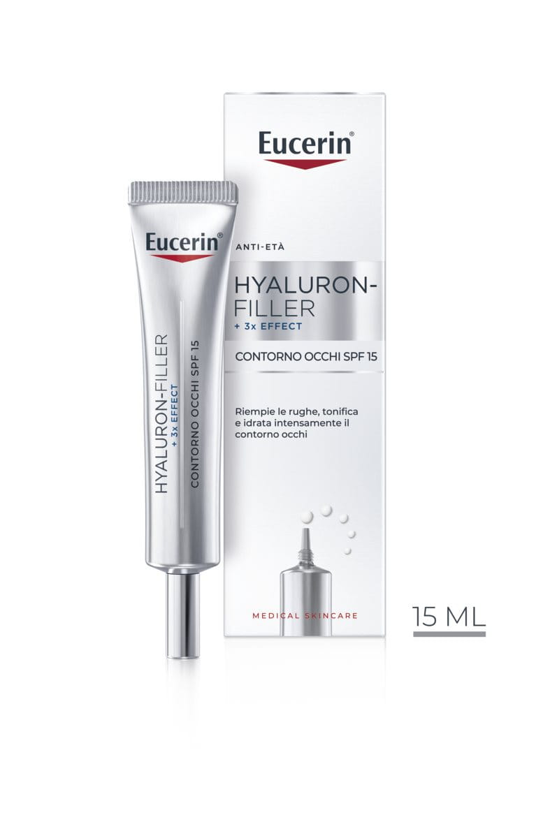 Con il passare del tempo, la capacità della pelle di produrre naturalmente Acido Ialuronico e Collagene diminuisce, causando perdita di compattezza e formazione di rughe. Eucerin Hyaluron-Filler +3x Effect Contorno Occhi SPF 15, formulato con Acido Ialuronico, idrata la pelle del contorno occhi e riempie rughe e linee sottili. Inoltre, grazie alla protezione UVA/UVB ad ampio spettro, previene efficacemente l'invecchiamento precoce causato dal sole. .