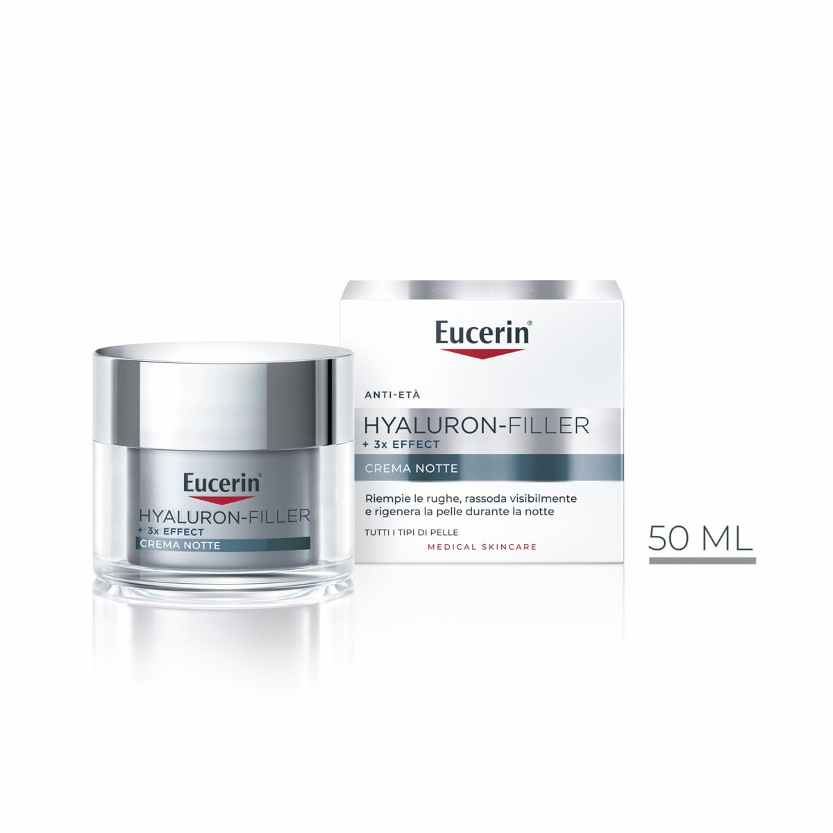 Crema Notte Anti-Età Con il passare del tempo, la capacità della pelle di produrre naturalmente Acido Ialuronico e Collagene diminuisce, causando perdita di compattezza e formazione di rughe. Eucerin Hyaluron-Filler +3x Effect Crema Notte, formulata con Acido Ialuronico, idrata la pelle e riempie rughe e linee sottili. Inoltre, la Glicin-Saponina stimola la naturale produzione di Acido Ialuronico e Collagene per una pelle più tonica e levigata, mentre il Dexpantenolo stimola il processo di rigenerazione durante la notte.